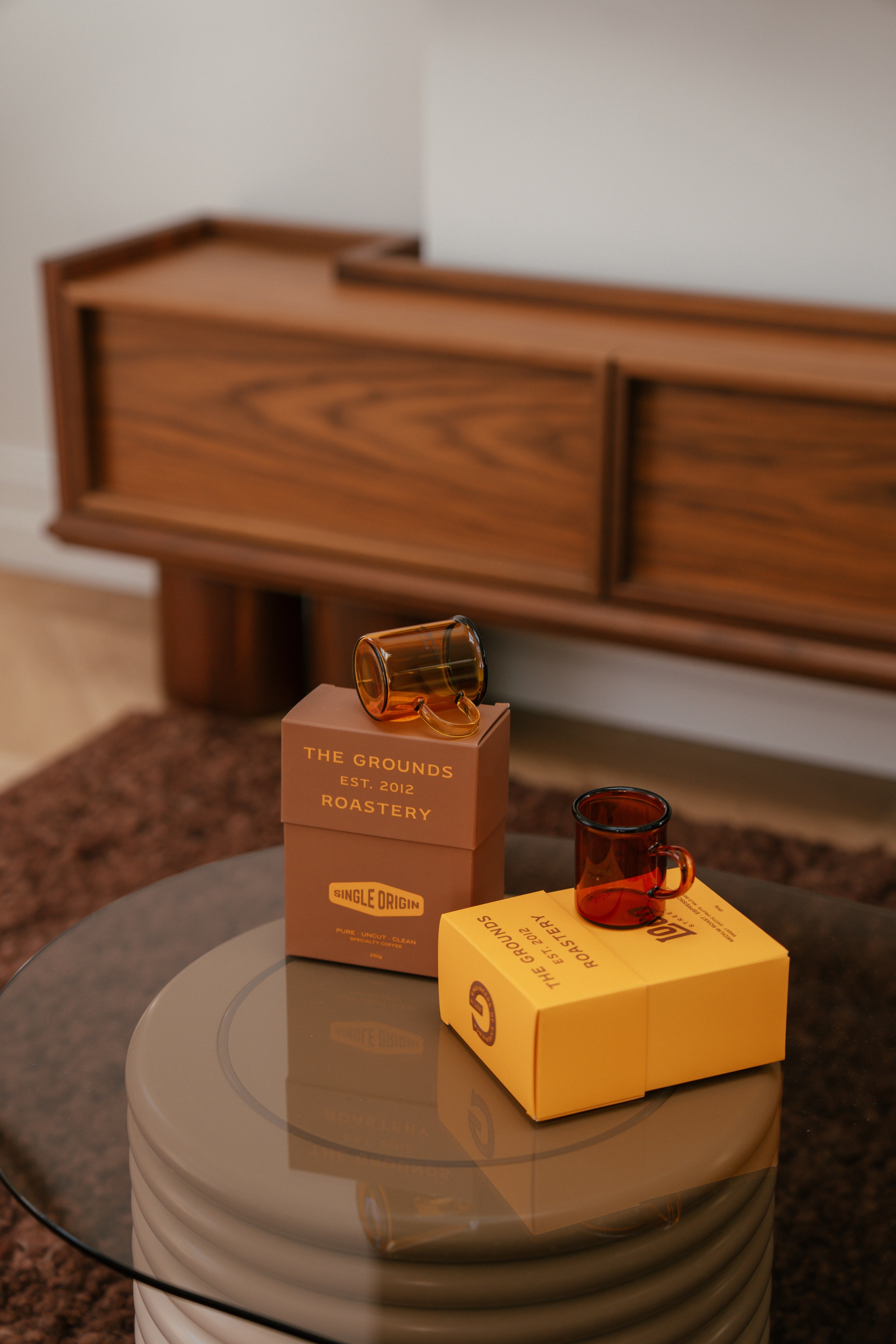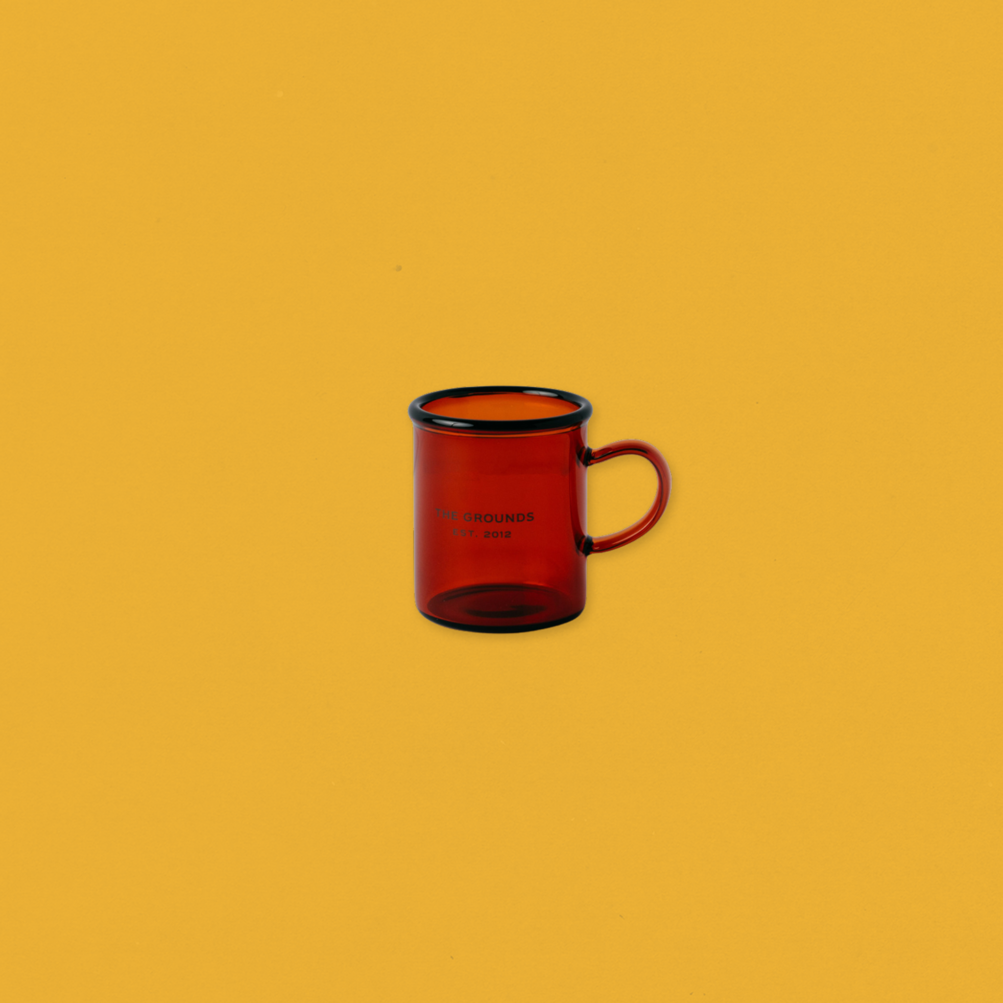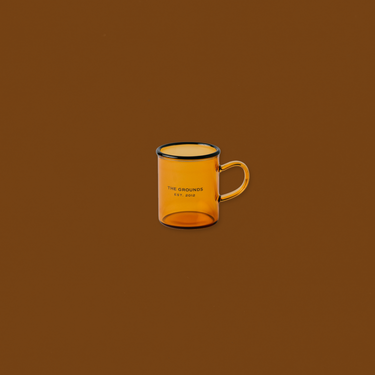 Small in size but big on charm, this 70ml espresso glass is crafted from amber-toned borosilicate glass with a fine black rim and a minimal The Grounds logo. Lightweight yet durable, it's the ideal companion for your morning espresso or short black.