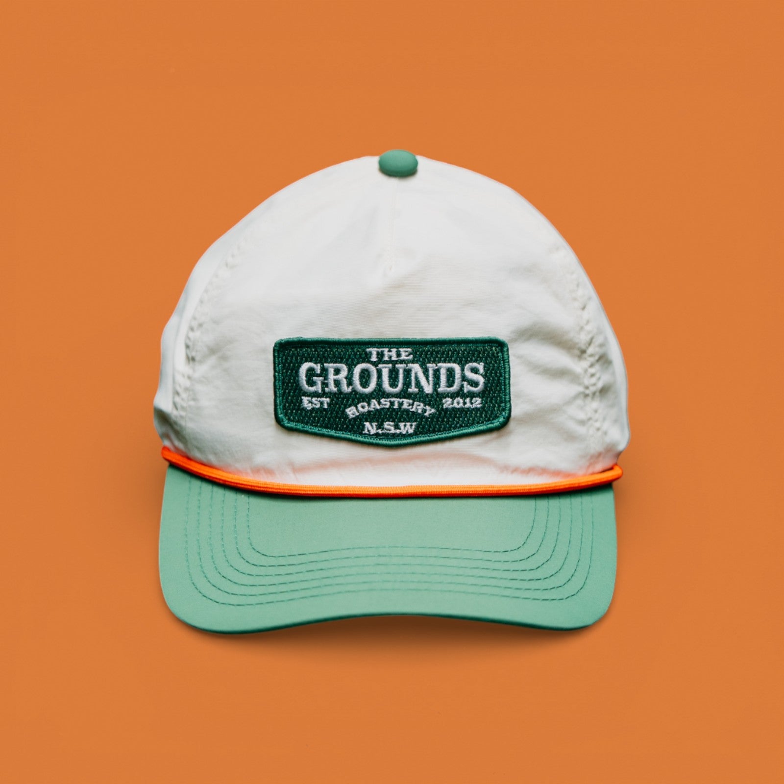 Constructed from a lightweight, crisp fabric in bright white, it features a fresh green brim and a standout neon-orange braided rope across the visor and adjustable snaps on the rear. The front is anchored by a woven heritage patch, proudly presenting The Grounds Roastery.