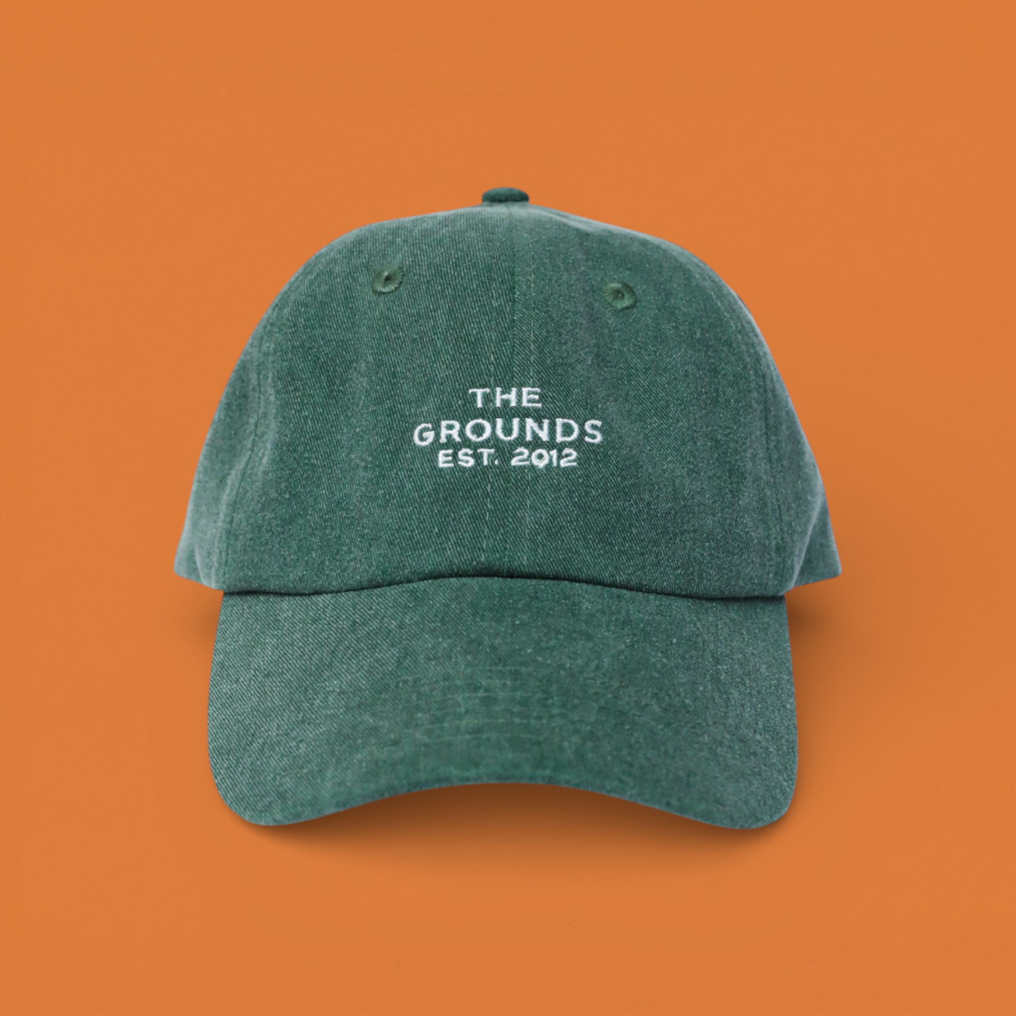 Cut from a durable cotton twill with a heavy wash, it features a faded, lived-in green hue that pairs perfectly with our industrial palette. The front is kept clean and minimal, with "THE GROUNDS EST. 2012" embroidered in crisp white thread—a quiet badge of honour for those who have been with us since the beginning.