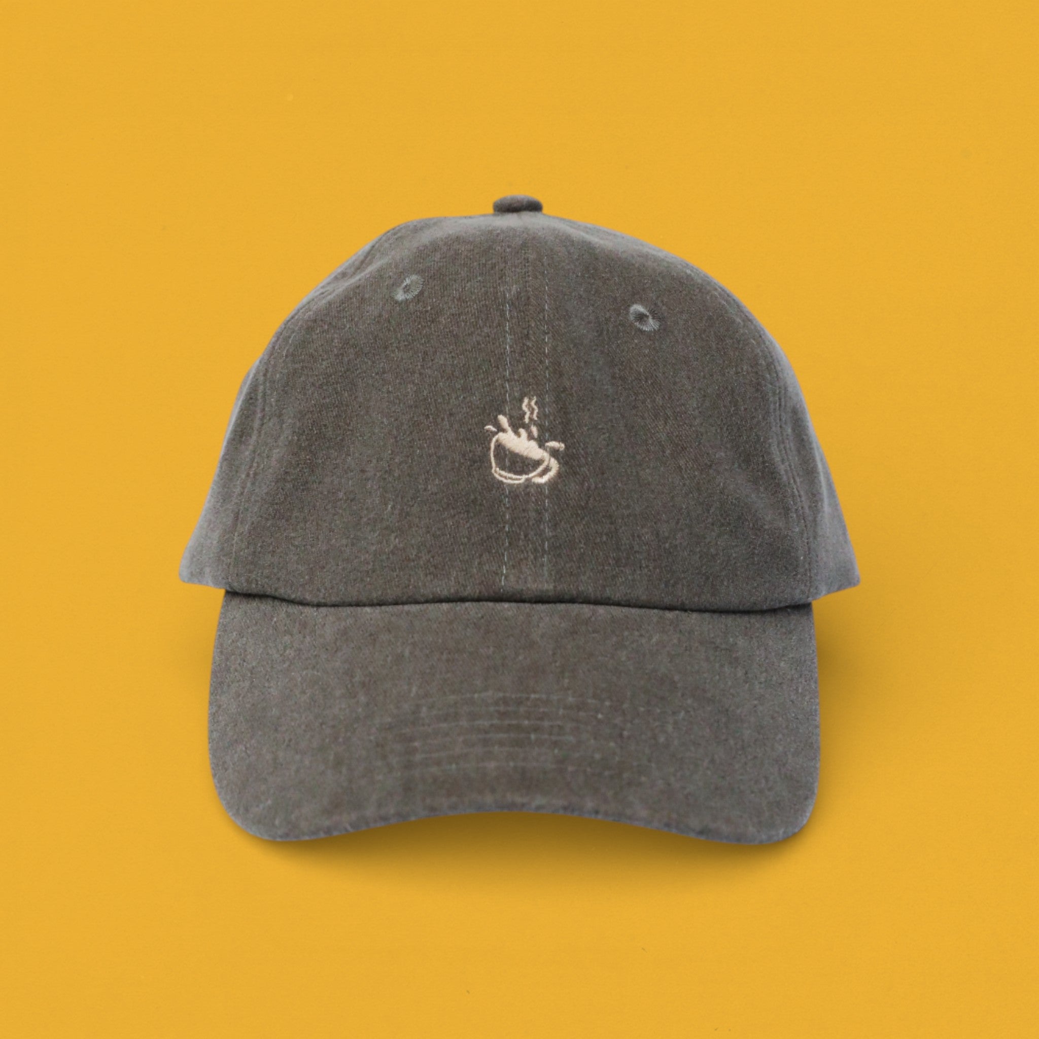 Crafted from a heavy washed cotton in a vintage charcoal-brown, this hat feels like an old friend from the first wear. The branding is deliberately subtle—a single, embroidered splashing coffee cup on the front, serving as a quiet "if you know, you know" signal to fellow coffee enthusiasts.